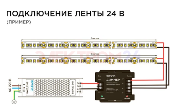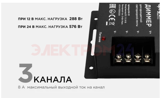 Важно отметить, что в зависимости от того, с каким напряжением предстоит работать устройству, будет отличаться и максимальная мощность нагрузки, которую можно подключить к нему. Так, при напряжении 12 В максимальная нагрузка будет равна 288 Вт, а при напряжении 24 В уже 576 Вт. К данному изделию вы можете подключить в два раза больше светодиодной ленты 24 В.