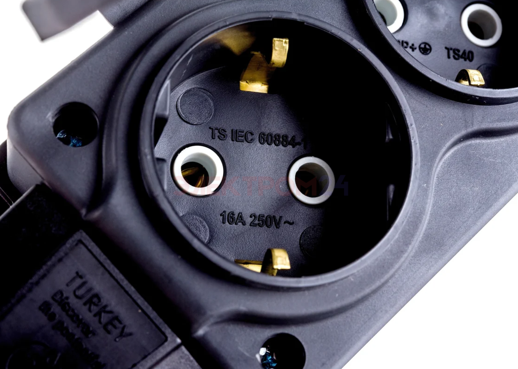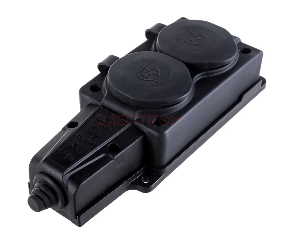 Штепсельная колодка с крышками, из каучука. Служит для присоединения к сети электропитания различных бытовых электроприборов мощностью до 3,6 кВт. Одновременное подключение до четырех единиц силового оборудования. Изделие предназначено для эксплуатации в суровых условиях - на открытом воздухе или во влажных или запыленных помещениях. Применяется на строительных площадках, в производственных цехах, в быту. Состав: эластомер, полиамид, электротехнический сплав.