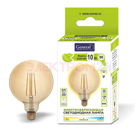 Отзывы к "Лампа светодиодная General Филамент GLDEN-G95S-10-230-E27-2700, 655308, E-27, 2700 К, золотая ":