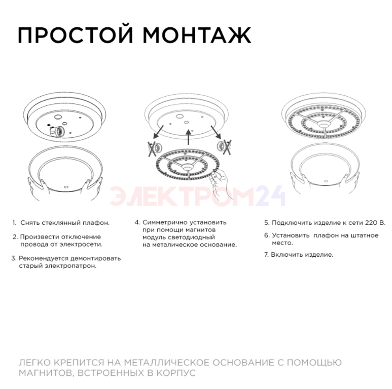 Служит гораздо дольше светодиодных ламп благодаря большей площади охлаждения. Легко крепится на металлическое основание с помощью магнитов.
