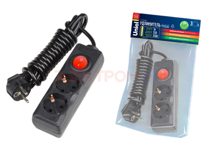 Шнур 3м.. 2 гнезда. с-з. Черный. TM Uniel.