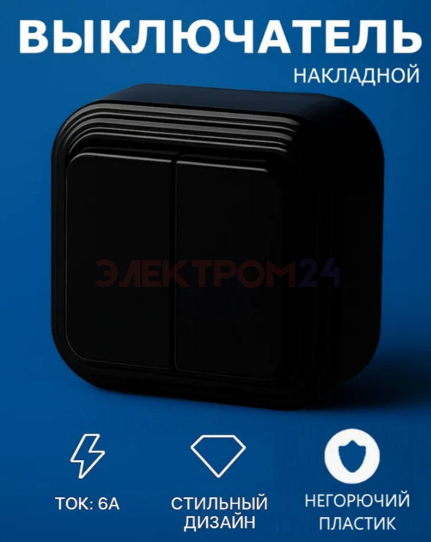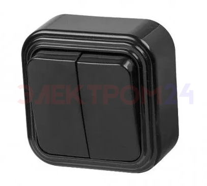 Двухклавишный выключатель предназначен для накладного монтажа, обладает защитой корпуса по классу IP20. Выключатель черный с двумя клавишами, без подсветки. В качестве материала основания служит термопластик. Оптимальное решение для торговых центров, павильонов, зданий из сэндвич-панелей, где невозможно штробление стен. Дополнительные характеристики: Материал корпуса - пластик АБС. Степень защиты по ГОСТ IP20 - защита от проникновения твердых тел размером более 12мм. Вид климатического исполнения по ГОСТ 15150 - УХЛ4. Номинальное напряжение - 250В. Тип комплектации: выключатель в сборе. Max ток 6 А.